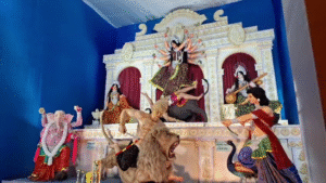 Berhampore Durga Puja 2025 এই পুজো মুর্শিদাবাদ জেলায় প্রাচীন ও ঐতিহ্যবাহী পুজো হিসেবে পরিচিত। ষাট বছর ধরে খাগড়া শ্মশান ঘাট দুর্গাপুজো কমিটি তাদের নিজস্ব গাম্ভীর্য ও শৃঙ্খলার মধ্য দিয়ে দেবীপূজা করে আসছে। এবছরও সেই ধারা অক্ষুণ্ণ রেখেই প্রতিমায় আনা হয়েছে নতুনত্বের ছোঁয়া। পুজোর মণ্ডপে প্রবেশ করলেই দর্শনার্থীরা দেখতে পাচ্ছেন, দেবী দুর্গা মহিষাসুরকে বধ করছেন, আর সেই অসুরের চেহারা যেন ট্রাম্পের প্রতিচ্ছবি।