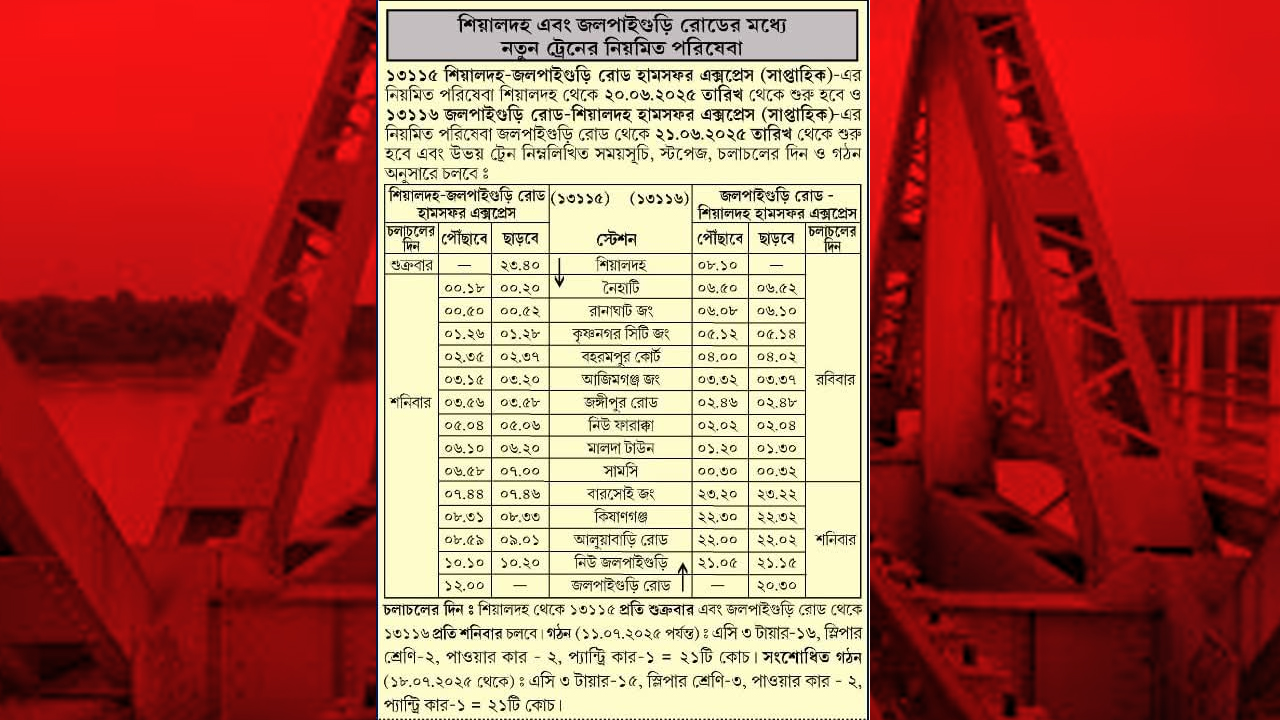 New Train শনিবার রাত ৮ টা ৩০ মিনিটে জলপাইগুড়ি রোড থেকে ছাড়বে ১৩১১৬ জলপাইগুড়ি রোড শিয়ালদহ হামসফর এক্সপ্রেস। রাত ৯ টা ১৫ মিনিটে ছাড়বে নিউ জলপাইগুড়ি স্টেশন থেকে। মালদায় সময় রাত ১ টা ৩০। রবিবার ভোর ৪ টে ২ মিনিটে ছাড়বে বহরমপুর স্টেশন থেকে। সকাল ৮ টা ১০ মিনিটে পৌঁছে যাবে শিয়ালদহে।
