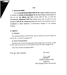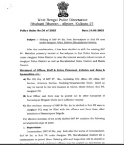 Police Battalion ব্যারাকপুর থেকে মুর্শিদাবাদের সুতিতে সরানো হল পুলিশ ব্যাটালিয়ন। রাজ্য সশস্ত্র পুলিশের ৮ নম্বর ব্যাটেলিয়নকে স্থানান্তর। ব্যারাকপুর থেকে জঙ্গিপুর পুলিশ জেলার সুতি থানায় স্থানান্তর। ১৬ ই জুন পুলিশ ব্যাটালিয়ন স্থানান্তরের বিজ্ঞপ্তি জারি করা হয়।